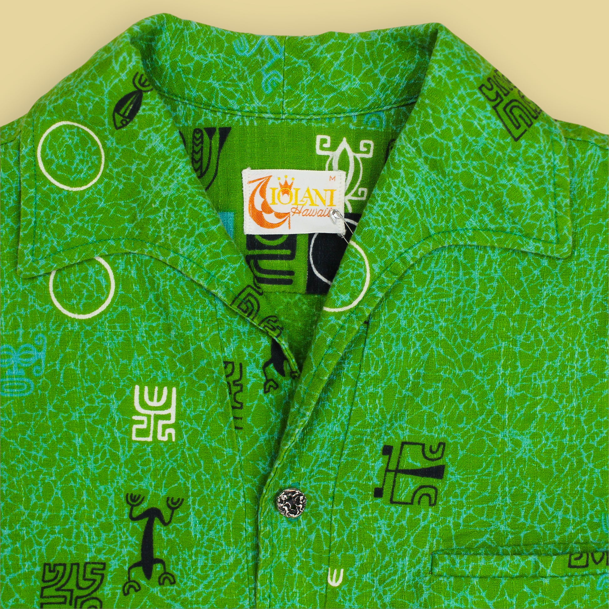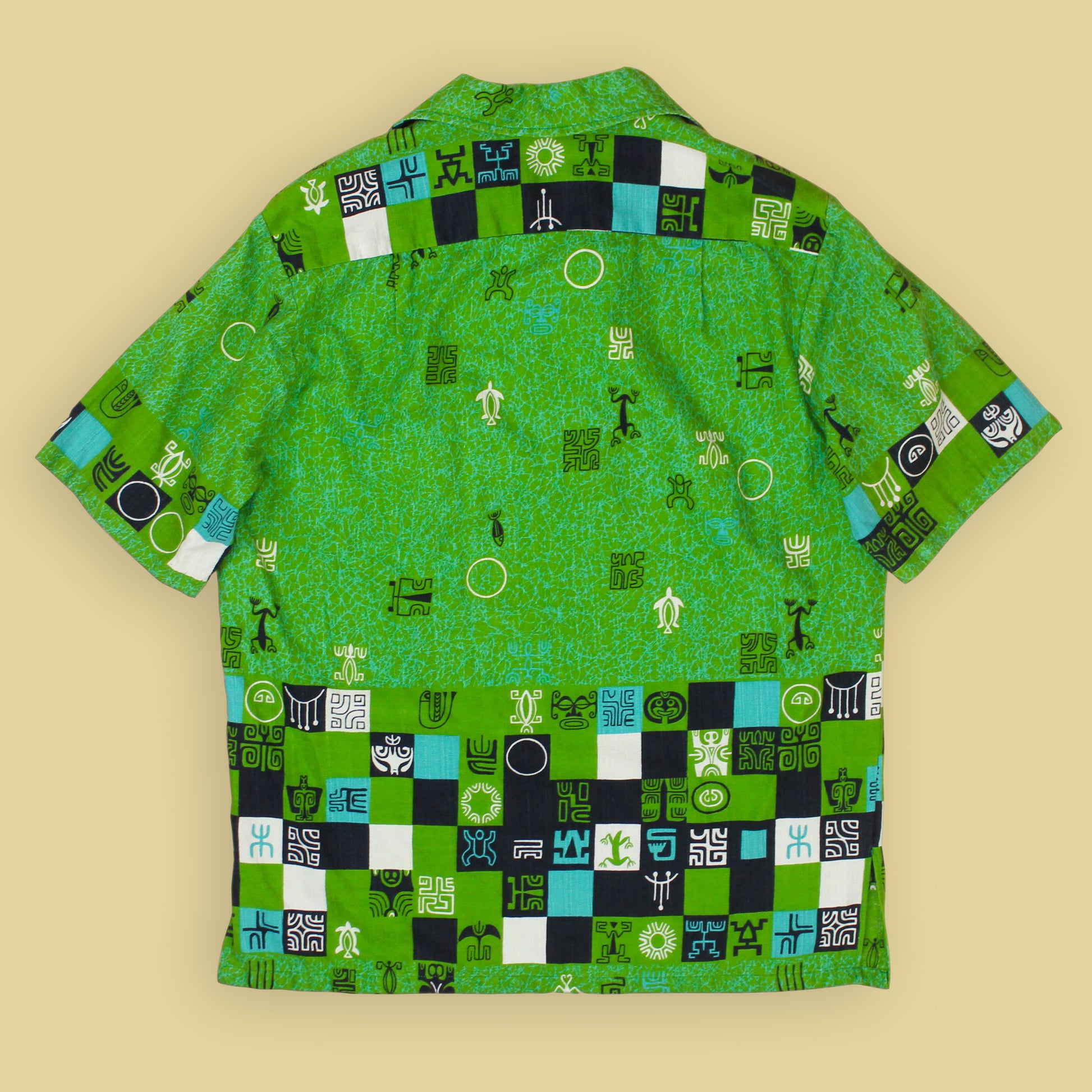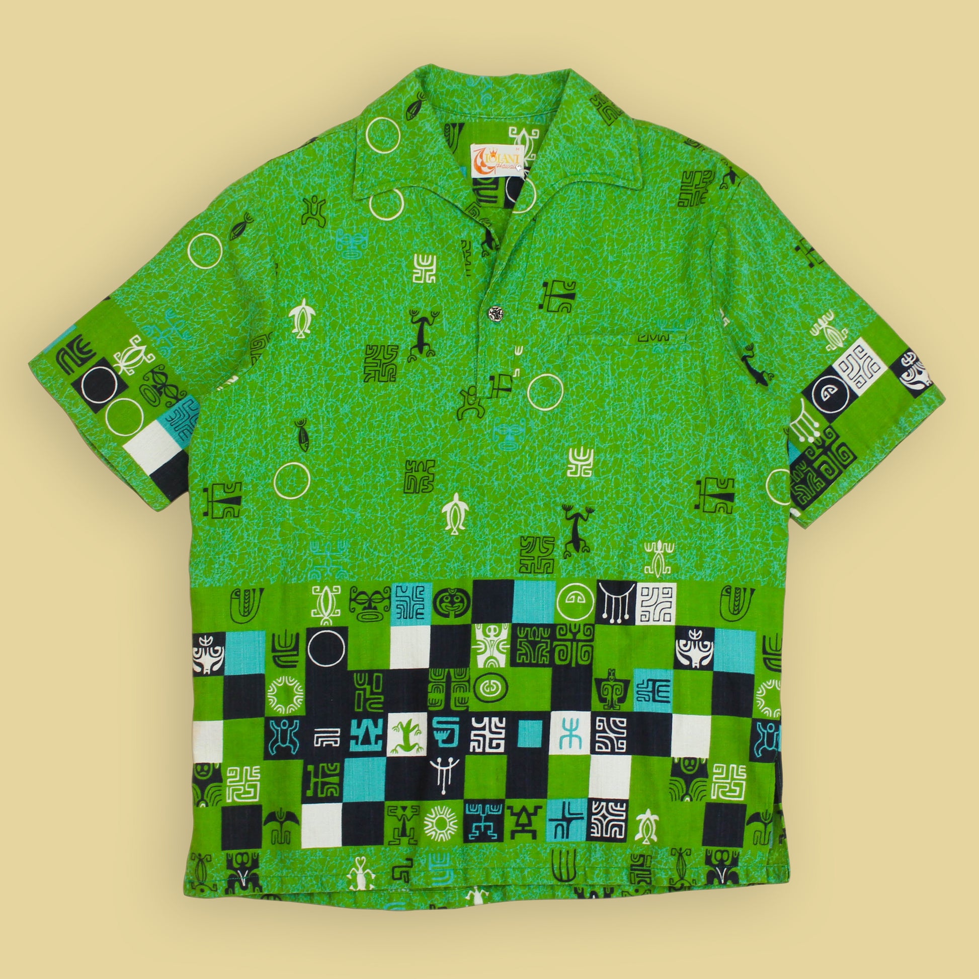 Iolani Tiki Print Bark Cloth Tunic-Style Hawaiian Shirt